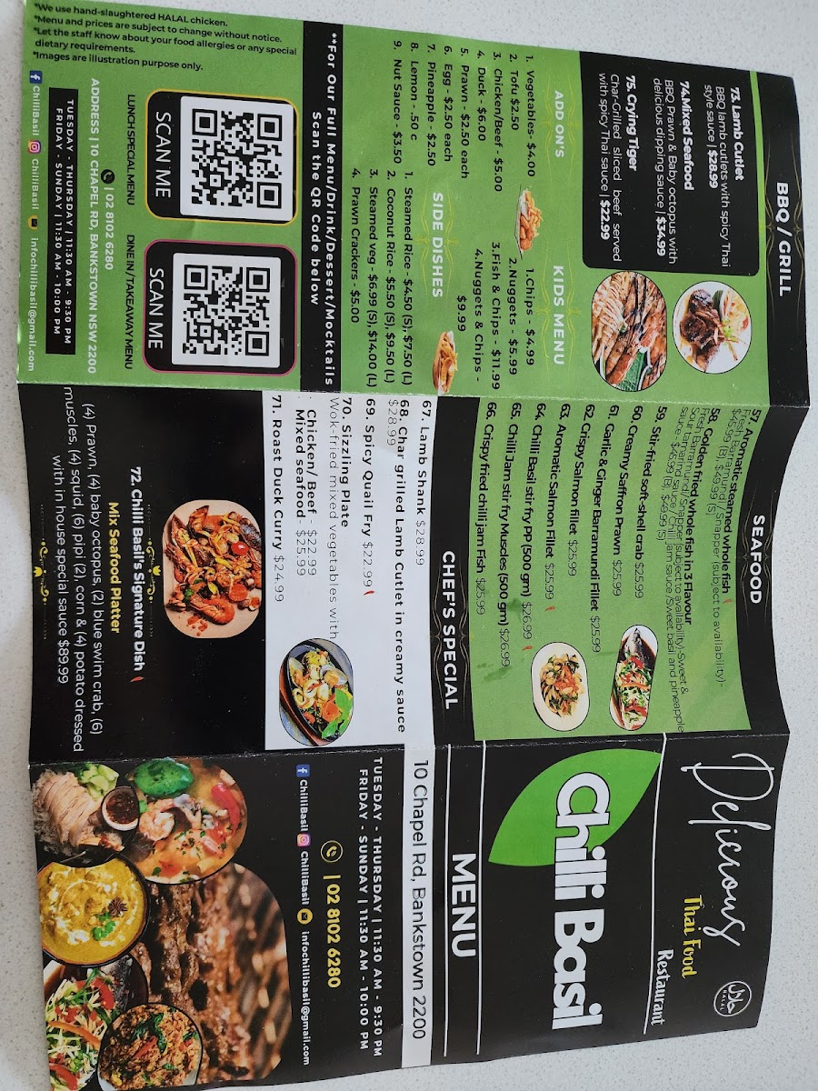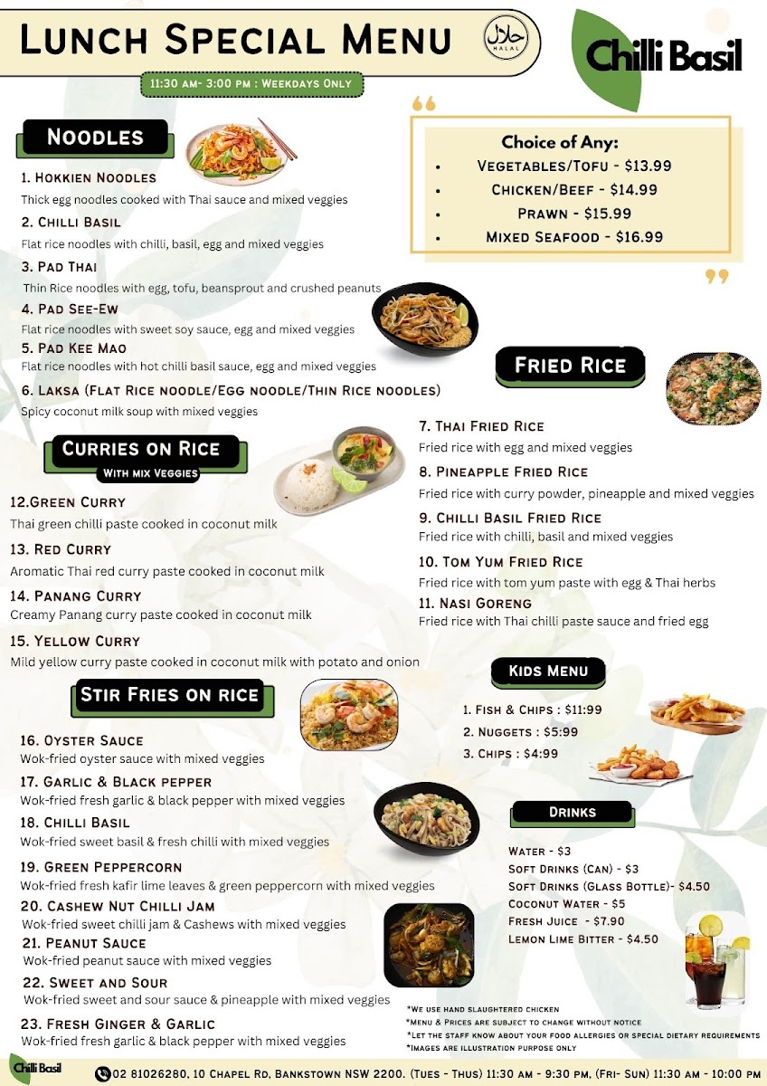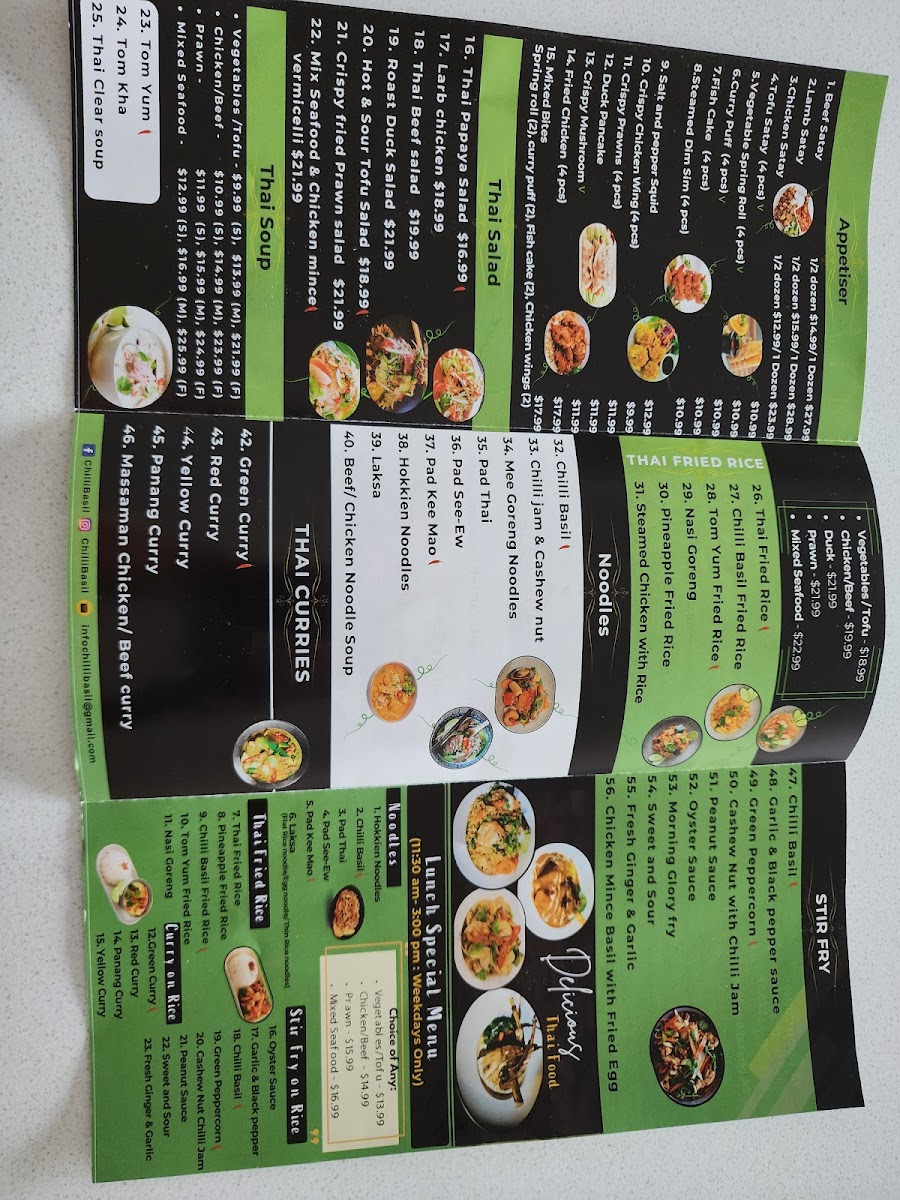 From a reviewer’s perspective, the menu at Chilli Basil Authentic Thai Restaurant offers a well-rounded selection of classic Thai dishes across multiple categories, making it easy to find something satisfying whether you want a light side or a full meal. The side options like Steamed Rice, Coconut Rice, Steamed Vegetables, and Prawn Crackers pair nicely with flavorful curries such as Green Curry, Red Curry, Yellow Curry, Panang Curry, and the rich Massaman Chicken Or Beef Curry. Stir-fry lovers can enjoy dishes like Sweet And Sour, Oyster Sauce, Peanut Sauce, Fresh Ginger & Garlic, and Garlic & Black Pepper Sauce, while the salad selection includes refreshing choices such as Thai Papaya Salad, Larb Chicken, Thai Beef Salad, Hot & Sour Tofu Salad, and Mix Seafood & Chicken Mince Vermicelli Salad. The appetizers like Crispy Chicken Wing (4 Pieces), Steamed Dim Sim (4 Pieces), Vegetable Spring Roll (4 Pieces), Duck Pancake, and Fish Cake (4 Pieces) are great starters, and soups like Tom Yum, Tom Kha, and Thai Clear Soup add comforting options. For mains, the fried rice and noodle dishes such as Thai Fried Rice, Chilli Basil Fried Rice, Tom Yum Fried Rice, Pineapple Fried Rice, Nasi Goreng, Pad Thai, Pad See-Ew, Chilli Basil, Hokkien Noodles, and Chilli Jam & Cashew Nut provide plenty of variety, while seafood dishes like Golden Fried Whole Fish In 3 Flavour, Stir-Fried Soft-Shell Crab, Creamy Saffron Prawn, Crispy Salmon With Fillet, and Aromatic Salmon Fillet round out the menu with more premium options. Overall, the menu is diverse, featuring many recognizable Thai favorites along with customizable add-ons and a simple drinks list including Water, Soft Drinks (Can), Soft Drinks (Glass Bottle), Coconut Water, and Fresh Juice.