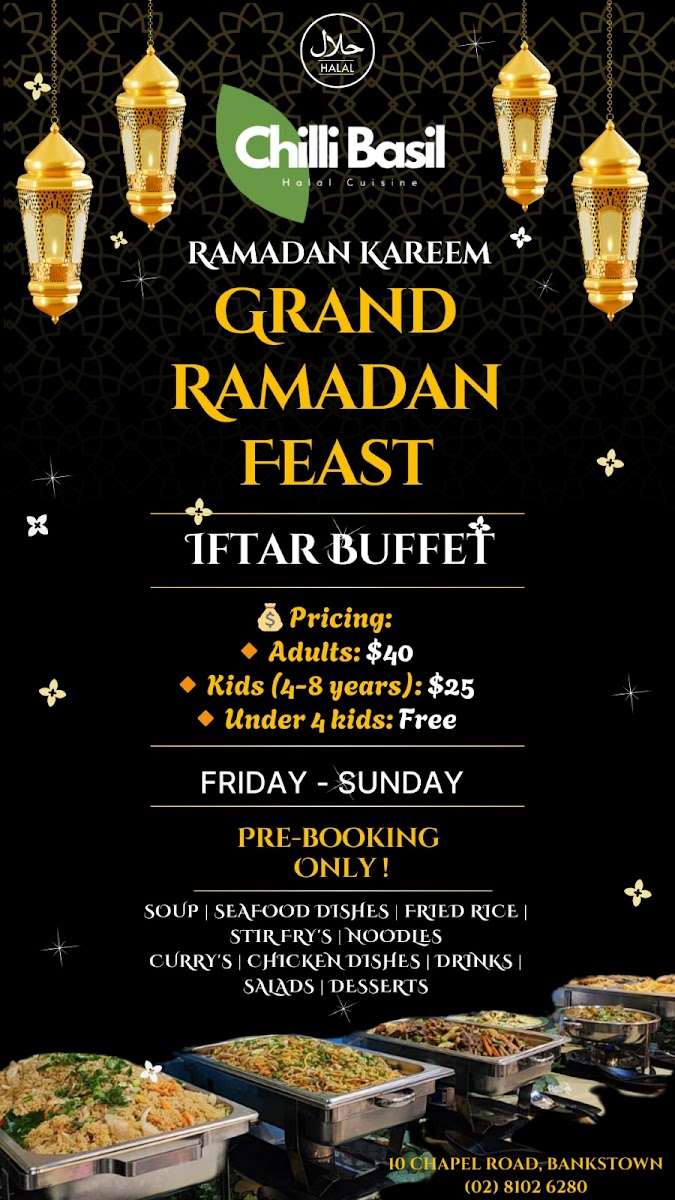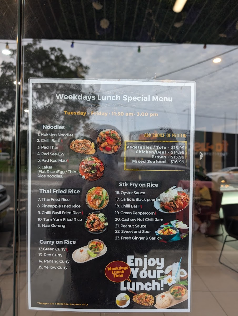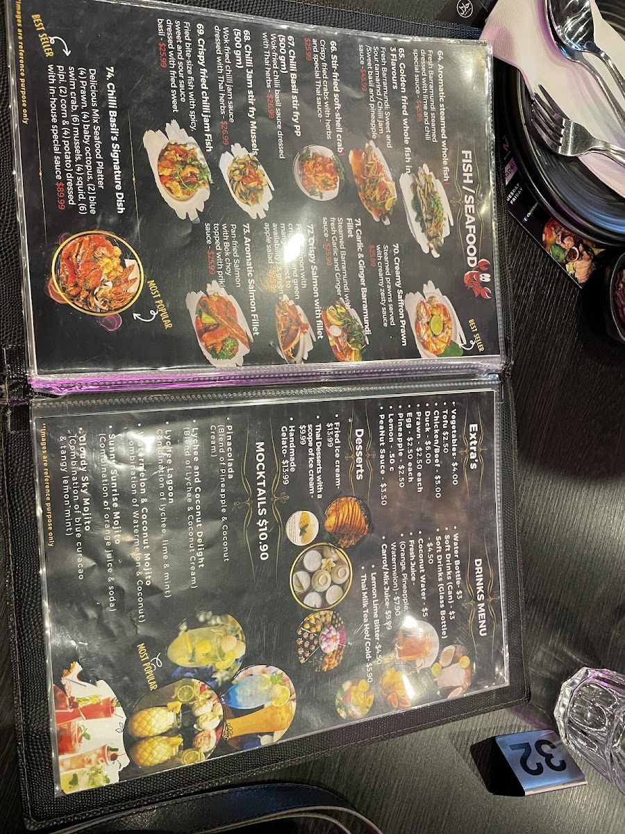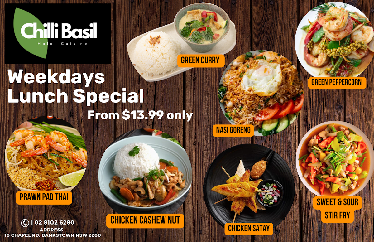 From a reviewer’s perspective, the menu at Chilli Basil Authentic Thai Restaurant offers a well-rounded selection of classic Thai dishes across multiple categories, making it easy to find something satisfying whether you want a light side or a full meal. The side options like Steamed Rice, Coconut Rice, Steamed Vegetables, and Prawn Crackers pair nicely with flavorful curries such as Green Curry, Red Curry, Yellow Curry, Panang Curry, and the rich Massaman Chicken Or Beef Curry. Stir-fry lovers can enjoy dishes like Sweet And Sour, Oyster Sauce, Peanut Sauce, Fresh Ginger & Garlic, and Garlic & Black Pepper Sauce, while the salad selection includes refreshing choices such as Thai Papaya Salad, Larb Chicken, Thai Beef Salad, Hot & Sour Tofu Salad, and Mix Seafood & Chicken Mince Vermicelli Salad. The appetizers like Crispy Chicken Wing (4 Pieces), Steamed Dim Sim (4 Pieces), Vegetable Spring Roll (4 Pieces), Duck Pancake, and Fish Cake (4 Pieces) are great starters, and soups like Tom Yum, Tom Kha, and Thai Clear Soup add comforting options. For mains, the fried rice and noodle dishes such as Thai Fried Rice, Chilli Basil Fried Rice, Tom Yum Fried Rice, Pineapple Fried Rice, Nasi Goreng, Pad Thai, Pad See-Ew, Chilli Basil, Hokkien Noodles, and Chilli Jam & Cashew Nut provide plenty of variety, while seafood dishes like Golden Fried Whole Fish In 3 Flavour, Stir-Fried Soft-Shell Crab, Creamy Saffron Prawn, Crispy Salmon With Fillet, and Aromatic Salmon Fillet round out the menu with more premium options. Overall, the menu is diverse, featuring many recognizable Thai favorites along with customizable add-ons and a simple drinks list including Water, Soft Drinks (Can), Soft Drinks (Glass Bottle), Coconut Water, and Fresh Juice.